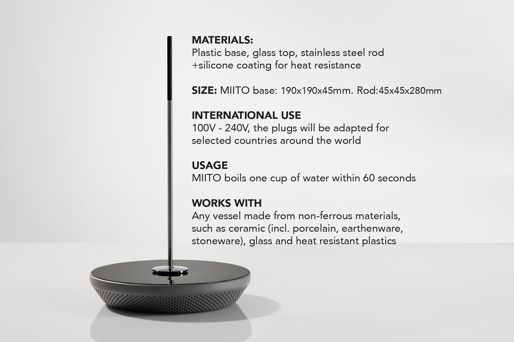 MIITO Precise propose un système reposant sur l’induction. En effet, ce dernier fonctionne à l’aide d’une plaque à induction qui prend la forme du socle du produit, ainsi qu’une baguette en métal dont le sommet est habillé d’une enveloppe en silicone afin que son utilisateur ne se brûle pas lors de la manipulation. Contrairement aux solutions habituelles à induction, ce n’est pas le fond du récipient qui chauffe mais la baguette qui, une fois plongée dans le récipient, vient réchauffer en moins d’une minute le contenant.