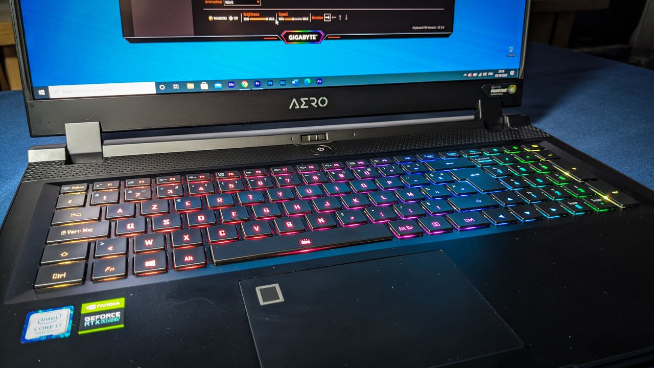 Dans le cas présent, notre Gigabyte Aero est équipé d’une dalle 17 pouces aux multiples avantages. La définition Ultra HD de 3840 x 2160 pixels est le premier. Le fait qu’il s’agisse d’une dalle HDR 400 (pour une puissance lumineuse importante) et IPS (pour de larges angles de vision) en sont deux autres. La certification Pantone clôture le tout puisqu’elle garantit une couverture de 100% de l’espace colorimétrique Adobe RGB.