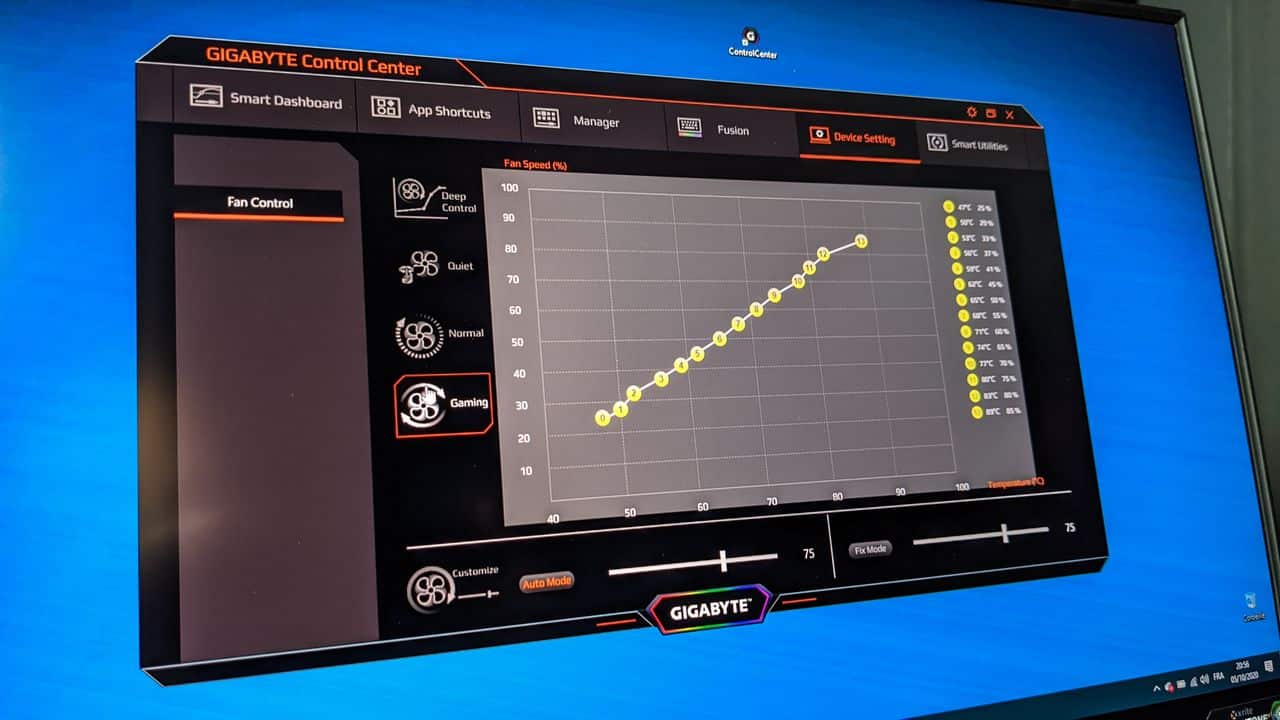 Nous n’irons pas plus loin sur les performances de notre modèle, car celui-ci n’est plus en vente, mais nous préciserons également que nous sommes assez fans du Gigabyte Control Center qui permet non seulement d’ajuster les paramètres de rétroéclairage du clavier ou le choix du mode d’utilisation « quiet, normal, gaming, etc », mais également de maintenir à jour les pilotes de composants intégrés dans le PC portable.