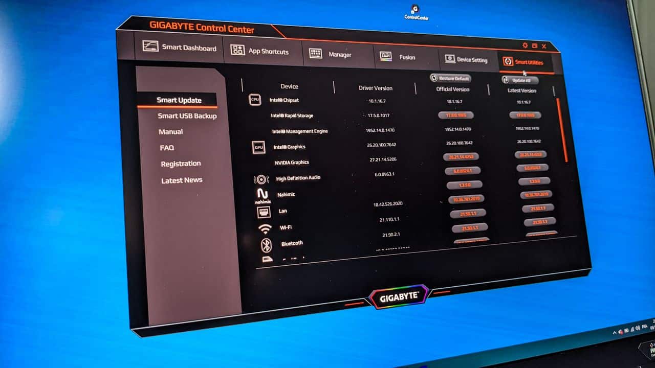 Nous n’irons pas plus loin sur les performances de notre modèle, car celui-ci n’est plus en vente, mais nous préciserons également que nous sommes assez fans du Gigabyte Control Center qui permet non seulement d’ajuster les paramètres de rétroéclairage du clavier ou le choix du mode d’utilisation « quiet, normal, gaming, etc », mais également de maintenir à jour les pilotes de composants intégrés dans le PC portable.