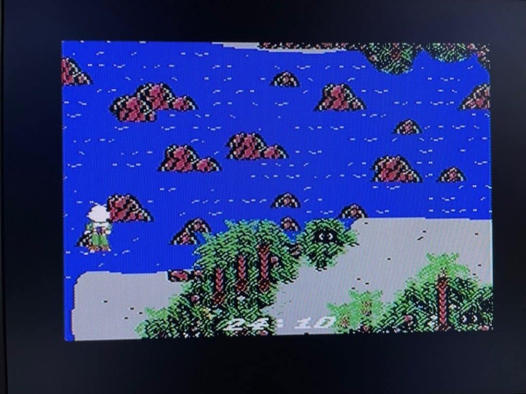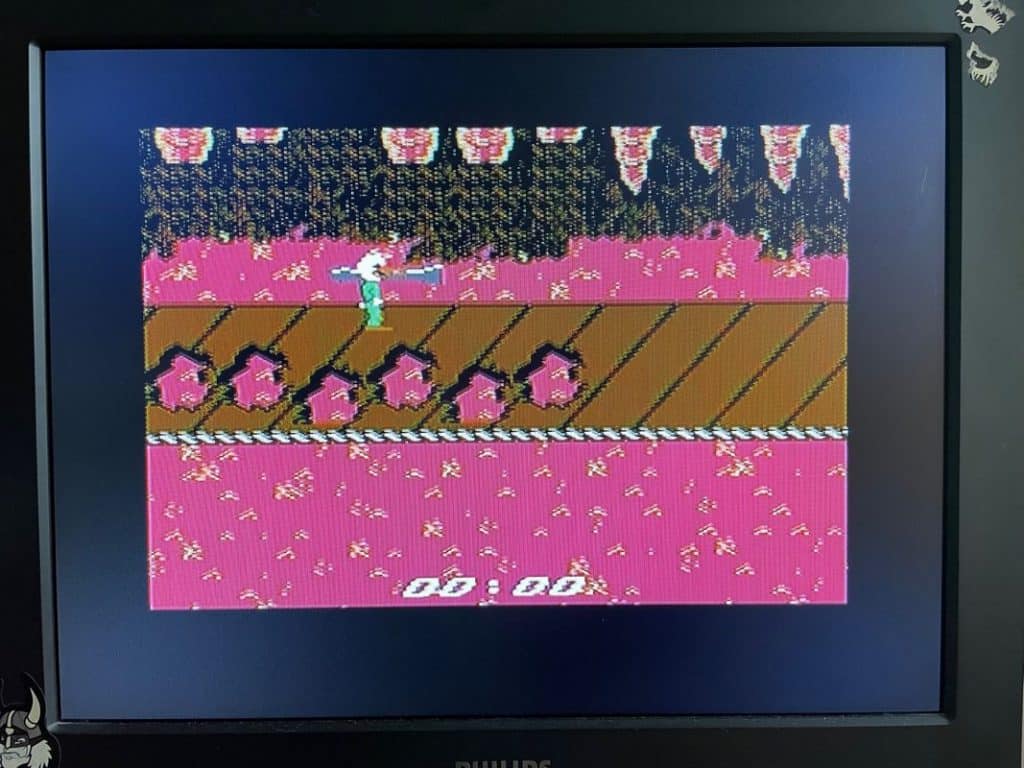 Au début de votre partie vous allez devoir aller chercher un Jet Solaire pour pouvoir traverser la rivière et aller de l’autre côté. La logique veut donc qu’un canard ne sait pas nager sans son Jet Solaire. Une fois celui-ci récupérer en évitant les sables mouvants, vous pouvez traverser la rivière en appuyant à la façon Track’n Field le bouton du joystick pour prendre de la vitesse. C’est là que j’ai pris conscience de l’horrible maniement de mon personnage. Je commençais à subodorer l’arnaque.