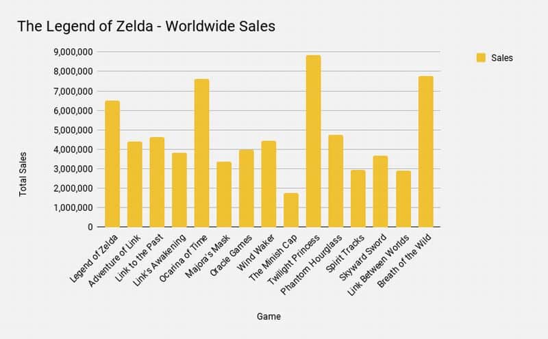 Dans la saga Zelda, les deux champions de la vente sont donc Twilight Princess et Breath of the Wild, suivis de près par Ocarina of Time. Le tout premier opus sur NES avait lui aussi atteint les 6,5 millions de ventes. Le plus gros flop de la saga revient à Minish Cap sur GameBoy Advance, avec moins de 2 millions de jeux vendus.